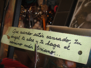 Hola Verónica, soy Cecilia, la mujer de Gustavo, el dueño de la tienda donde viste este mensaje. Me llenó de emoción ver cómo nuestros pequeños granitos de arena le pueden llenar el alma a gente que uno ni se imagina. En la Nochebuena de 2008, mis hijitas y yo hicimos unos budincitos muy chiquititos, los pusimos en bolsitas de celofán transparentes y escribimos mensajes, directo de nuestros corazones. Los cerramos y los atamos con unas cintitas en cada paquetito. Cada uno de los comensales tomaba su budincito sin saber qué mensaje le tocaba. A mi marido le tocó éste, justo en un año donde la realidad nos trató con mucha dureza y nos puso a prueba constantemente. Evidentemente, hay un alguien que siempre nos sostiene, nos guía, nos alivia y nos redime. Te mando un cariño y espero que la próxima vez que estés en Buenos Aires, vuelvas a visitarnos.