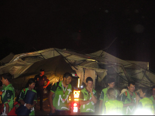 la bandera de España + otra pequeña azul era nuestra guía..miles de personas que entrábamos en riadas; campamento a suelo raso..