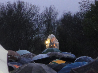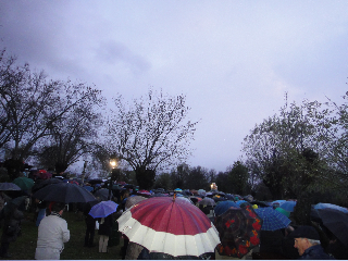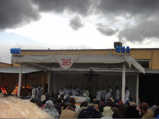 Veréis por las fotos el frío que pasamos..comenzamos sin lluvia pero llegaron los nubarrones y el diluvio..el cielo se ponía cada vez más gris..la gente es humilde y por eso anhelo ir cada sábado de encuentro con María..se cubrían con bolsas de basura la cabeza..te cubrían con su paraguas..compartí la ceremonia con una mujer al lado que no estaba bien y era una niña..me gustó taparla con su bufanda y abrigarla con amor..no le dejaba a su hermana escuchar la misa..ella sólo quería ir al prado de las apariciones..( está al lado pues la misa se celebra en carpa en otro lugar, cruzando la carretera)..